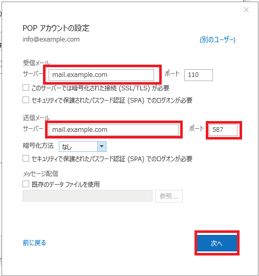 『サーバー』にサーバー情報を入力、『送信サーバー(SMTP)』 の番号を 『587』 に変更して、 『OK』 をクリックします。
