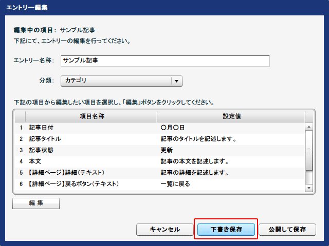 エントリーの編集画面のには 『下書き保存』 と 『公開して保存』 の2つのボタンがあります。『下書き保存』をクリックしてエントリーを保存しておくと、ホームページ本体を公開しても画面に表示させることなくインデックスモジュール内に文章を保持しておくことができます。