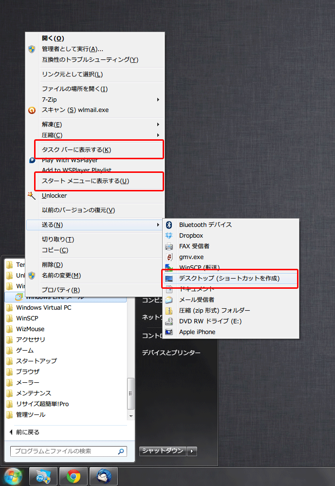 『すべてのプログラム』に格納されているプログラムのショートカットをアクセスしやすい場所に表示することができます。 デスクトップにショートカットを表示する タスクバー(=スタートボタンを含む帯状の部分)に表示する スタートメニュー(=スタートボタンを押した時に表示されるメニューの一覧)に表示する いずれも以下の要領で操作が可能です。 スタートボタン>すべてのプログラムから、 目的のプログラムが格納されているフォルダ をクリックして開きます。 プログラムのアイコンを右クリックして表示されるメニューから、 ご希望の場所にショートカットを表示するメニューをクリックしてください。