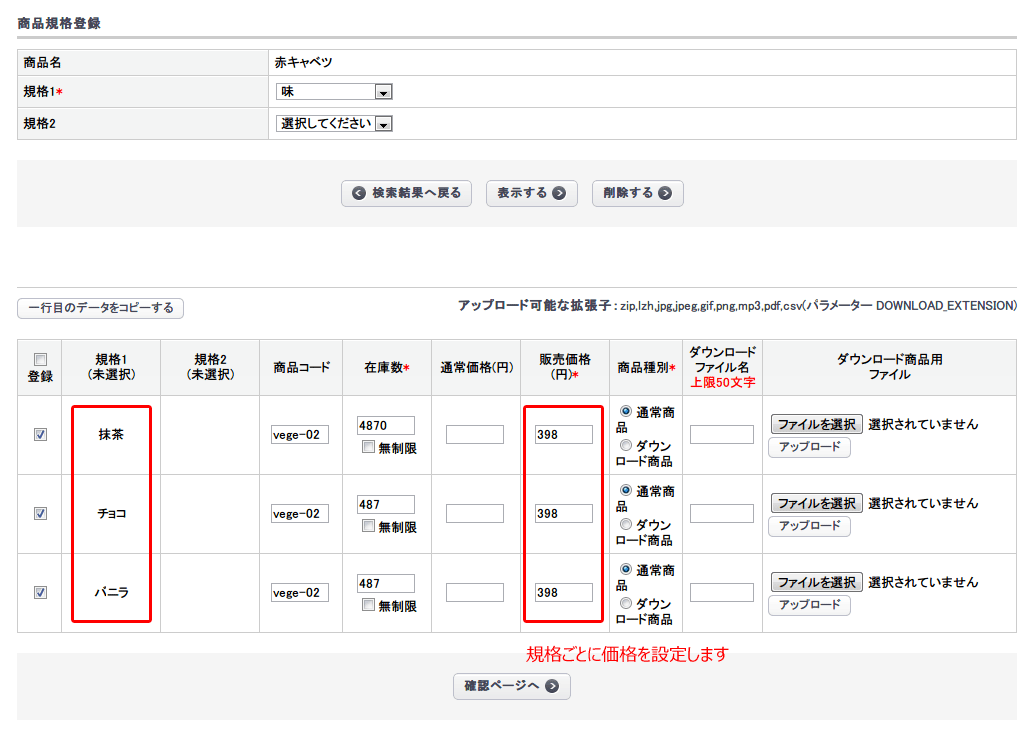 規格(※)が設定されている商品につきましては規格ごとに価格を設定いたします。