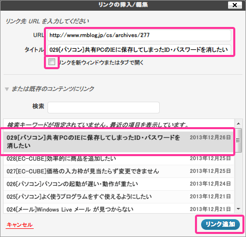 「URL」「タイトル」は自動で入力されます。 - 「リンクを新ウインドウでまたはタブで開く」はチェックを外してください。