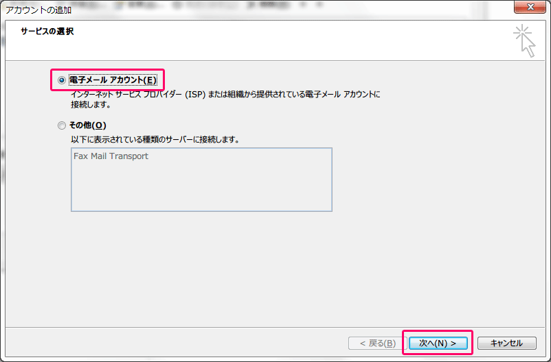『電子メールアカウント』→『次へ』の順番にクリックします。