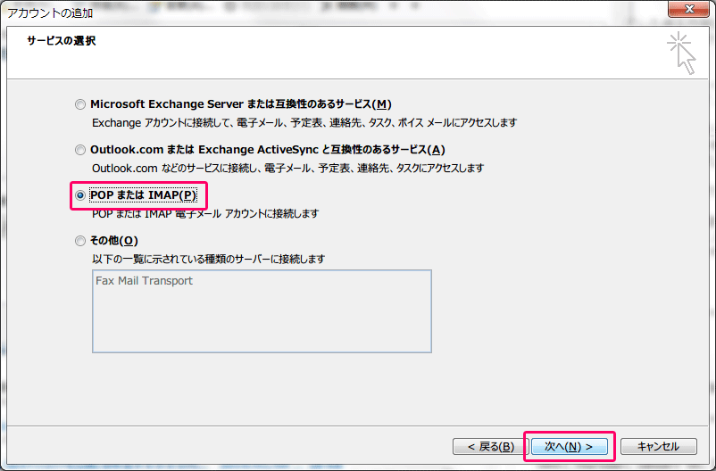 『POP または IMAP』にチェックを入れて、『次へ』 をクリックします。