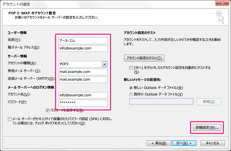 『メールサーバーへのログオン情報』 を入力して、『詳細設定』をクリックします。