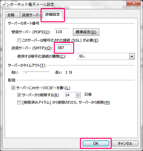『送信サーバー(SMTP)』 の番号を 『587』 に変更して、 『OK』?をクリックします。