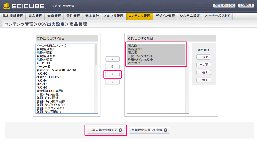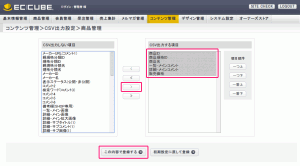 コンテンツ管理>CSV出力設定>商品管理 にてCSV形式で出力する項目を設定します。