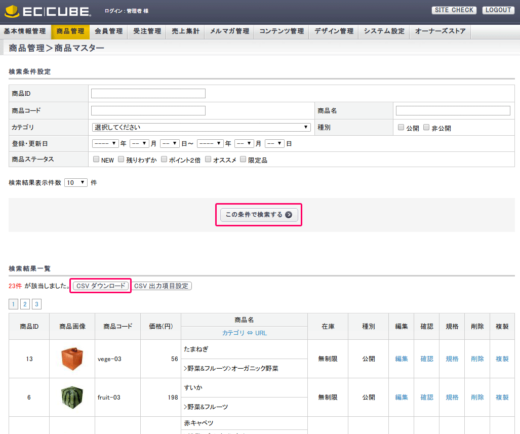 EC-CUBEの管理画面より、商品のリストをCSV形式でダウンロードすることができます。